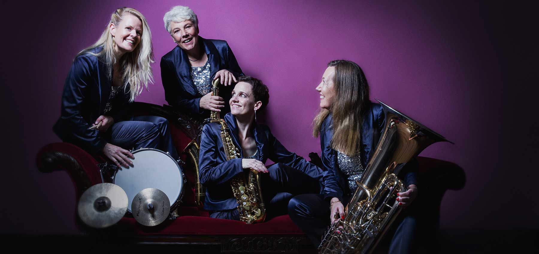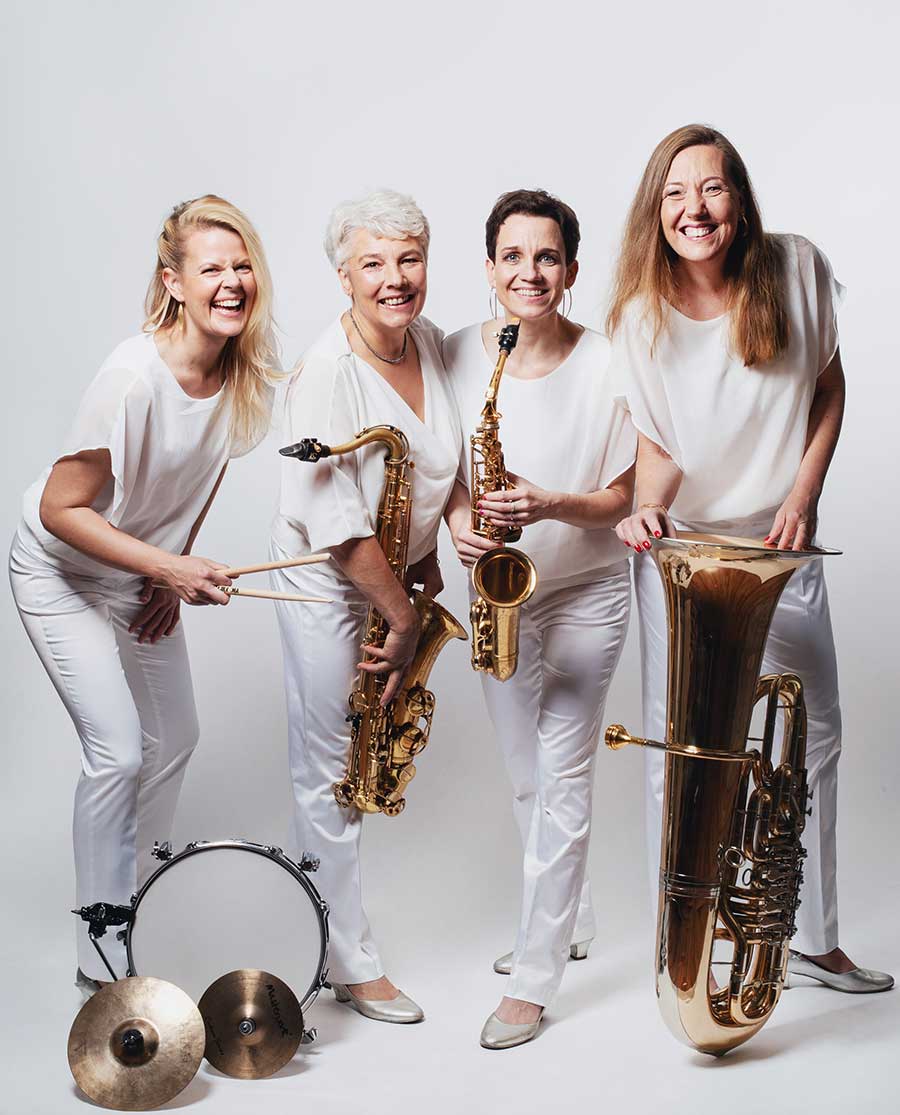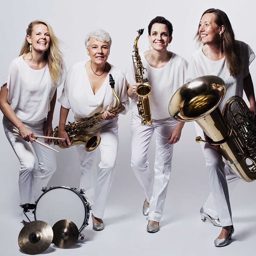 BrassAppeal – Musik, die berührt und begeistert. Die Frauenband mit zwei Saxophonen, Tuba und mobilen Drums bringt modernes Entertainment an jeden Ort.